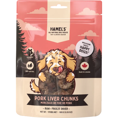 Hamel’s Pork Liver Freeze-Dried Dog Treats are made from a single ingredient: 100 percent premium pork liver. These natural treats are packed with protein and essential nutrients. They are an excellent source of vitamins A and B12, which help support a strong immune system, healthy digestion, and overall vitality. Each bite is gently freeze-dried to lock in natural flavour and nutrition.